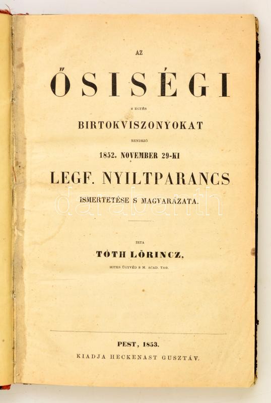 Tóth Lőrincz: Az ősiségi s egyéb birtokviszonyokat rendező 1852. novem... https://www.darabanth.com/en/28-Major-auction/28.1/Other-collectibles/Books-Law~11198/Toth-Lorincz-Az-osisegi-s-egyeb-birtokviszonyokat-rendezo-1852-november-29-ki-leg-nyiltpara~II1676453