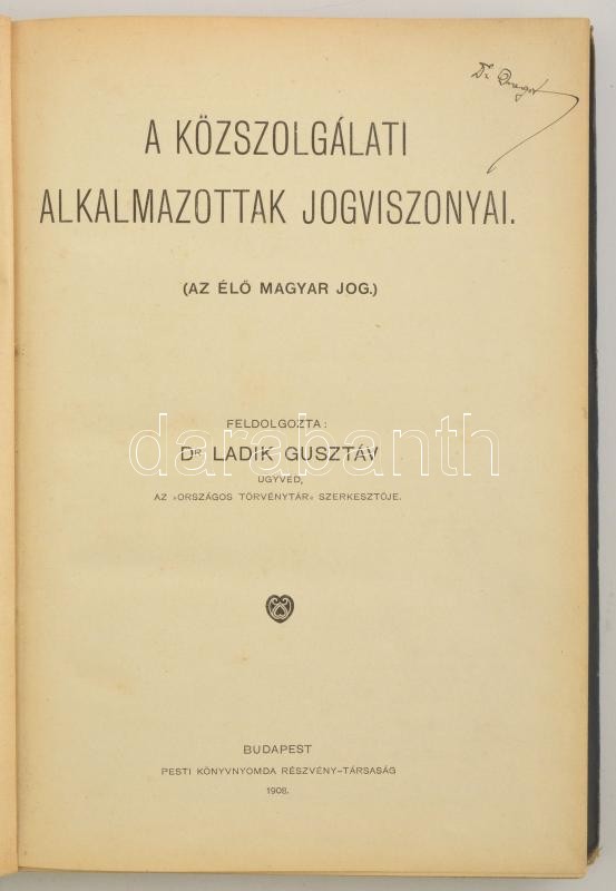 dr. Ladik Gusztáv: A közszolgálati alkalmazottak jogviszonyai : az élö... https://www.darabanth.com/en/28-Major-auction/28.1/Other-collectibles/Books-Law~11198/dr-Ladik-Gusztav-A-kozszolgalati-alkalmazottak-jogviszonyai-az-elo-magyar-jog-Dedikalt-pC3~II1681076