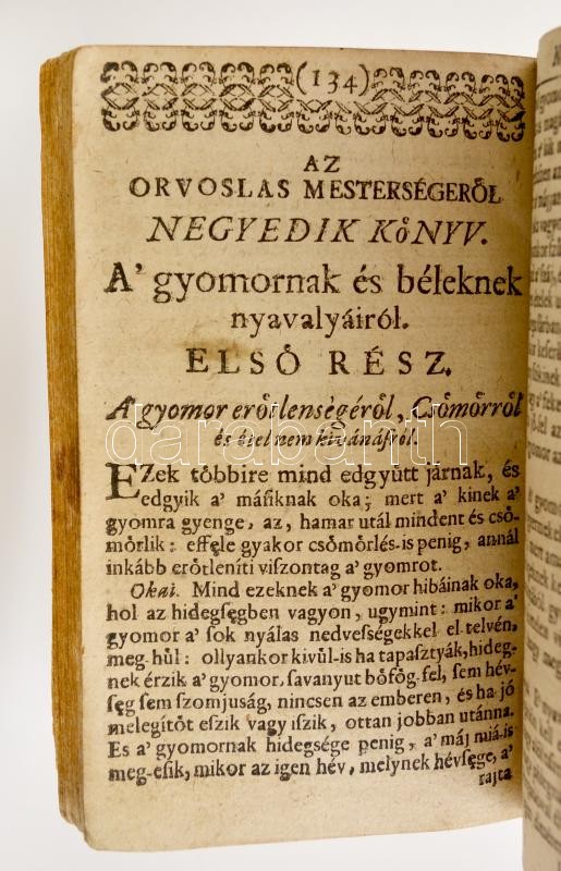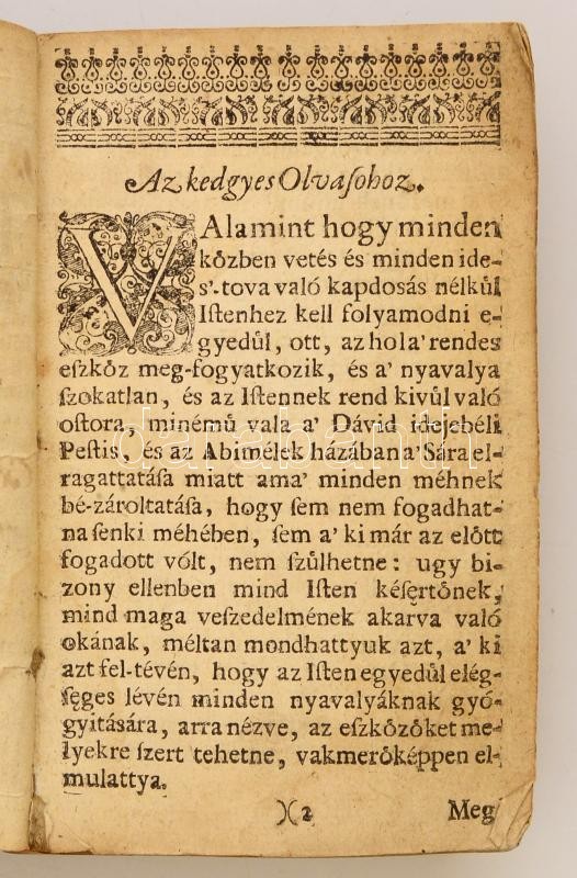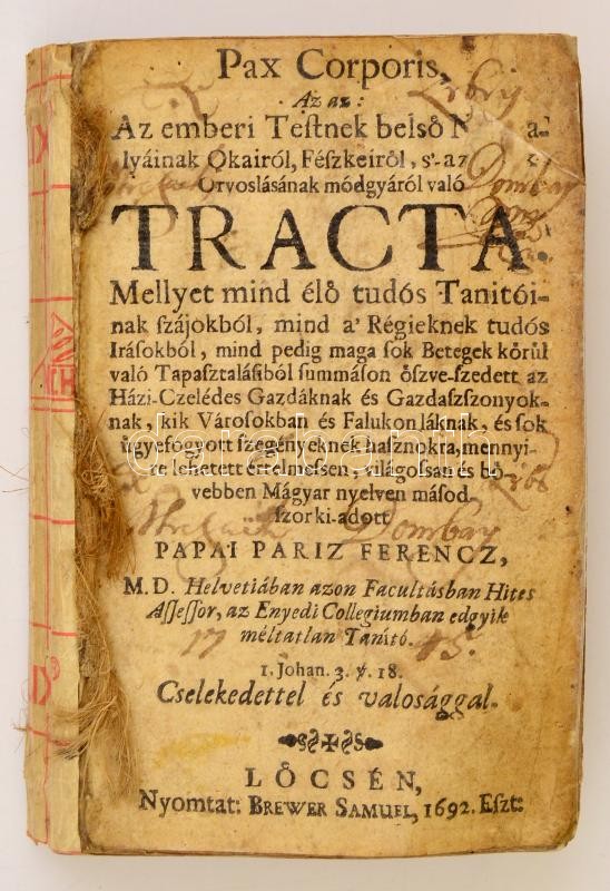 Pápai Páriz Ferenc: Pax Corporis. Az az: Az emberi testnek belsö nyavalyáinak okairól, fészkeiröl s-azoknak orvoslásának módgyáról való tracta. Lőcse, 1692, Brewer Samuel. 2. kiadás, 8 sztl. lev.+339 p.+3 sztl. lev. Fűzött kötésben, a borítója hiányzik, a címlapja javított, a gerince és a fűzése megerősített. Hiányos, a végéről 24 sztl. lev. hiányzik. A beleegyezése nélkül adták ki. Ritka!