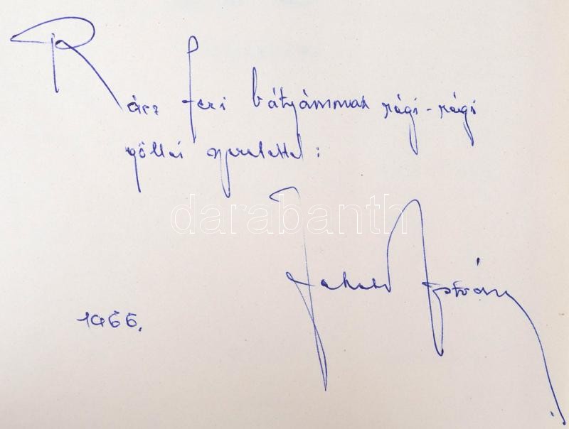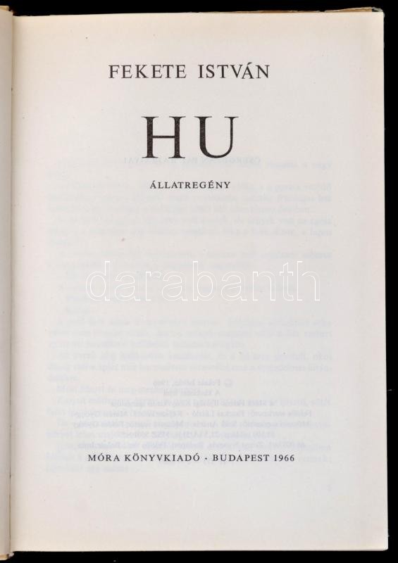 Fekete István: Hu. Csergezán Pál rajzaival. Bp.,1966, Móra. Első kiadás. Kiadói keménykötés, kiadói viseltes papír védőborítóban. A szerző, Fekete István (1910-1970) által dedikált Rácz Ferencnek, göllei kántor tanítónak, Rácz Vali (1911-1997) színész- és énekesnő apjának, aki Fekete István apja után lett a község tanítója és ott tanított 1910-től 1948-ig, dátumozással. "Rácz Feri bátyámnak régi-régi göllei szeretettel: Fekete István. 1966"