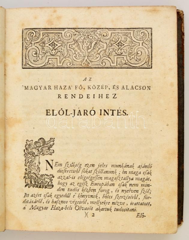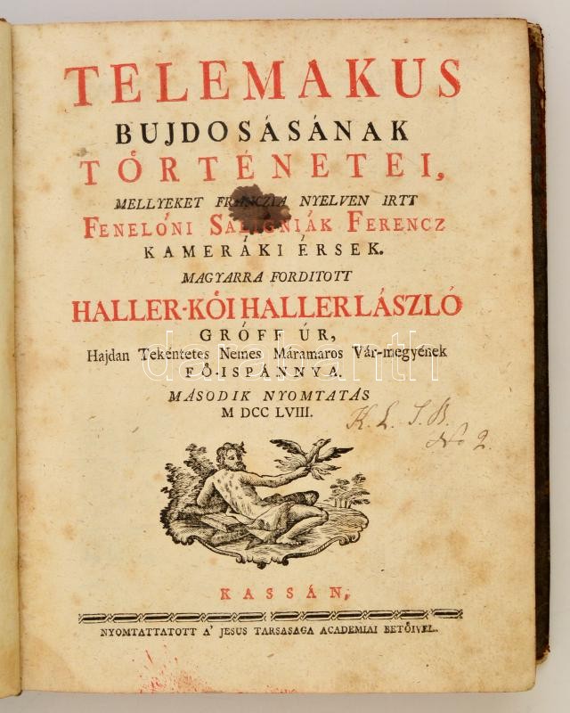Fenelon, François de Salignac de la Mothe] Fenelóni Saligniák Ferencz: Telemakus bujdosásának történetei, mellyeket franczia nyelven irtt Fenelóni Saligniák Ferencz kameráki érsek. Magyarra forditott Haller-kői Haller László gróff úr, hajdan tekéntetes nemes Máramaros vár-megyének fő-ispánnya. Második nyomtatás. Kassa, 1758. Nyomtattatott a Jesus Tarsasaga Academiai betőivel. [6] + 343 p. Korabeli, kissé kopott egészbőr kötésben.