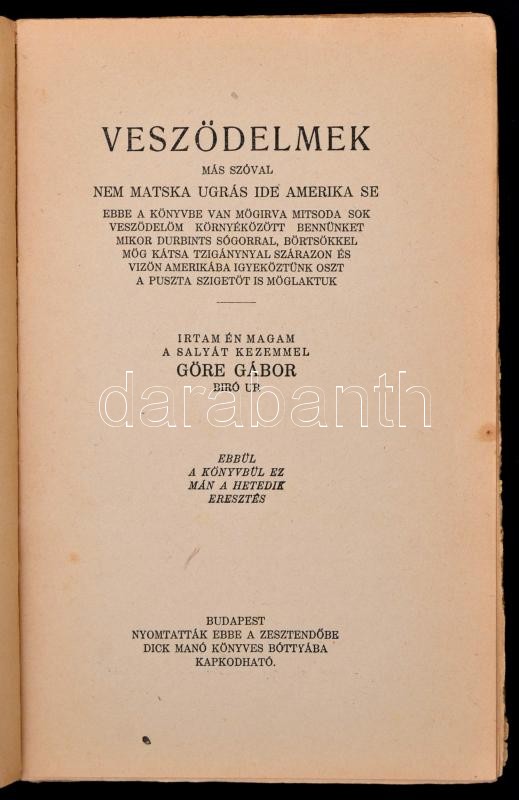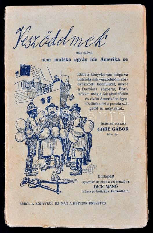 Description: Gárdonyi Géza: Veszödelmek más szóval nem matska ugrás ide Amerika se. Mühlbeck Károly rajzaival. Bp., é.n., Dick Manó, (Globus-ny.), Hetedik eresztés. Kiadói illusztrált papírkötés. Számozott, 2516. számú példány.