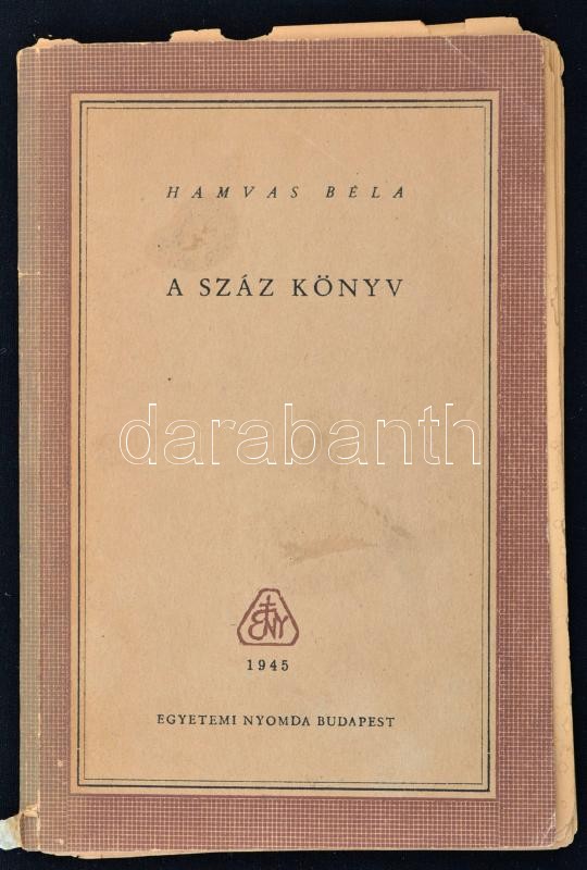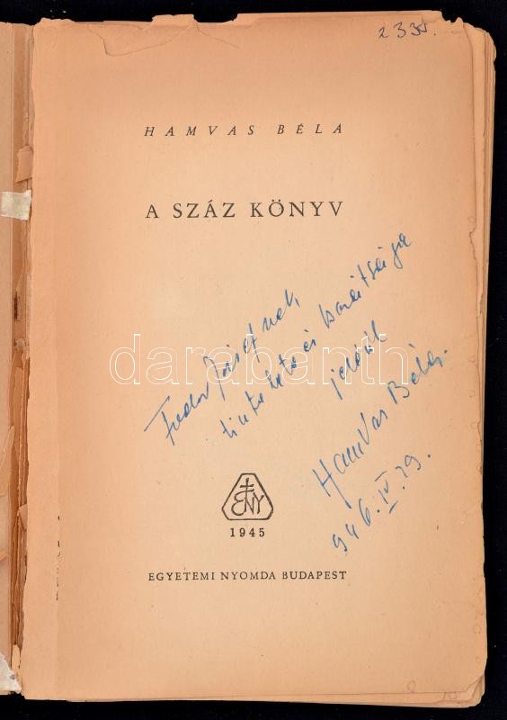Hamvas Béla: A száz könyv. Bp.,1945, Egyetemi Nyomda, 39 p. Első kiadás. Kiadói papírkötés, rossz állapotban, sérült, kijáró lapokkal. A szerző, Hamvas Béla (1897-1968) által dedikált példány barátja, Fodor József (1898-1973) költő, író, újságíró, műfordító részére.