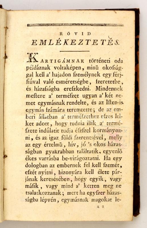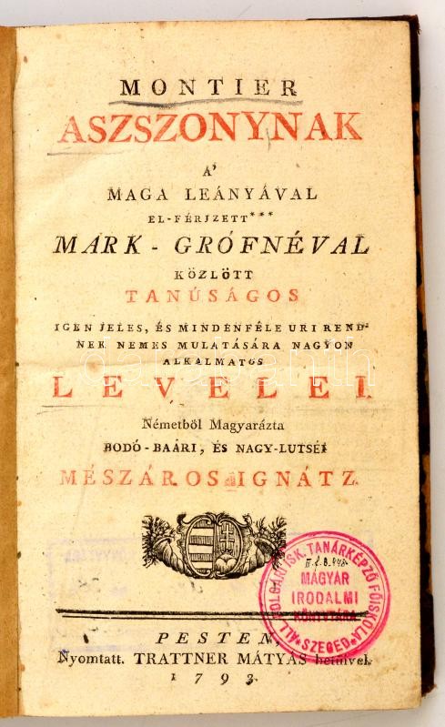 Leprince de Beaumont, Jeanne-Marie]: Montier aszszonynak a maga leányával el-férjezett *** Mark-grófnéval közlött tanúságos igen jeles, és mindenféle uri rendnek nemes mulatására nagyon alkalmatos Levelei.Németből magyarázta bodó-baári, és nagy-lútséi Mészáros Ignátz. Pest, 1793. Trattner Mátyás. [8] + 320 + [4] p. Későbbi félvászon kötésben.