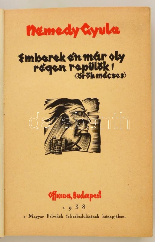 Nemedy Gyula: Emberek én már oly régen repülök! (örökmécses). Bp., 193... https://www.darabanth.com/en/28-Major-auction/28.1/Other-collectibles/Books-Other-rarities~11208/Nemedy-Gyula-Emberek-en-mar-oly-regen-repulok-orokmecses-Bp-1938-Officina-A-szerzo~II1681129