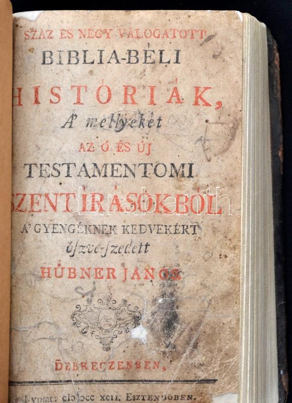 Hübner János: Száz és négy válogatott Biblia-béli históriák. Debrecen, 1792. Restaurált címlappal, kissé megviselt bőrkötésben.