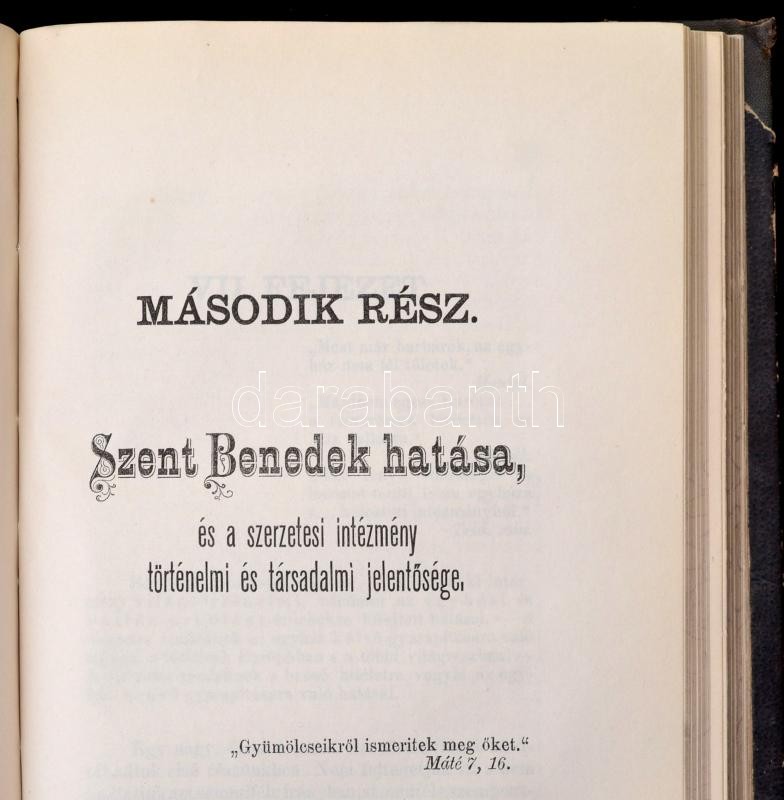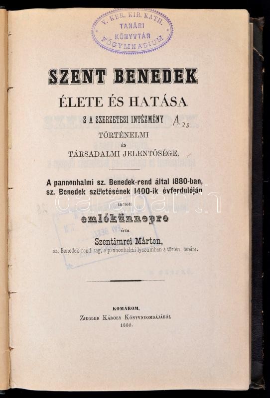 Szentimrei Márton: Szent Benedek élet és hátasa, s a szerzetesi intézmény történelmi és társadalmi jelentősége. A pannonhalmi sz. Benedek-rend által 1880-ban, sz. Benedek születésének 1400-ik évfordulóján tartott emlékünnepre írta Szentimrei Márton. Komárom, 1880, Ziegler Károly, 500 p. Átkötött kissé kopottas félvászon-kötés, a tartalomjegyzéknél aláhúzásokkal.