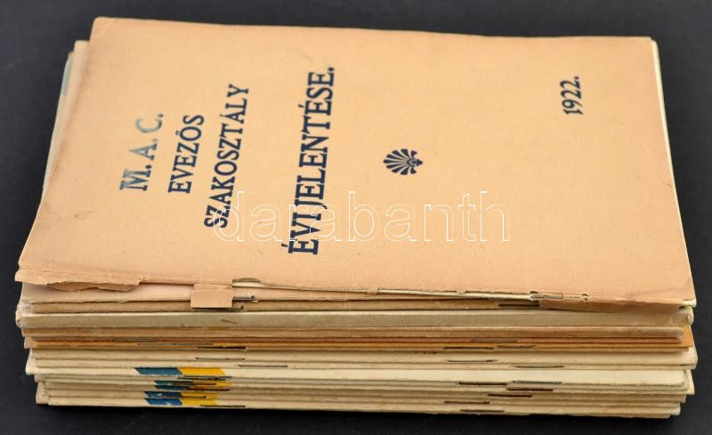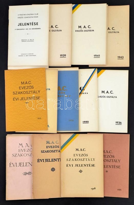 Description: 1922-1943 a Magyar Atlétikai Club Evezős Szakosztály évi jelentése: 1922-1925; 1928-1933; 1935-1943, összesen 19 db, számos érdekes írással, tűzött papírkötésben