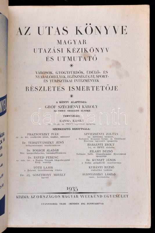 Az utas könyve. Magyar utazási kézikönyv és utmutató. Városok, gyógyfürdők, üdülő- és nyaralóhelyek, egészségügyi, sport- és turisztikai intézmények részletes ismertetője. A nagy magyar Alföld (Duna-Tisza köze nélkül) (Bp.) 1935, Országos Magyar Weekend Egyesület. X, 43-62 l., 575-684 l.: 1 lev. Számos szövegközti és egész oldalas fényképpel illusztrálva. Kiadói, foltos papírkötésben.