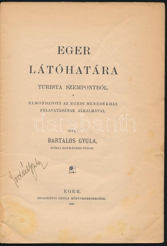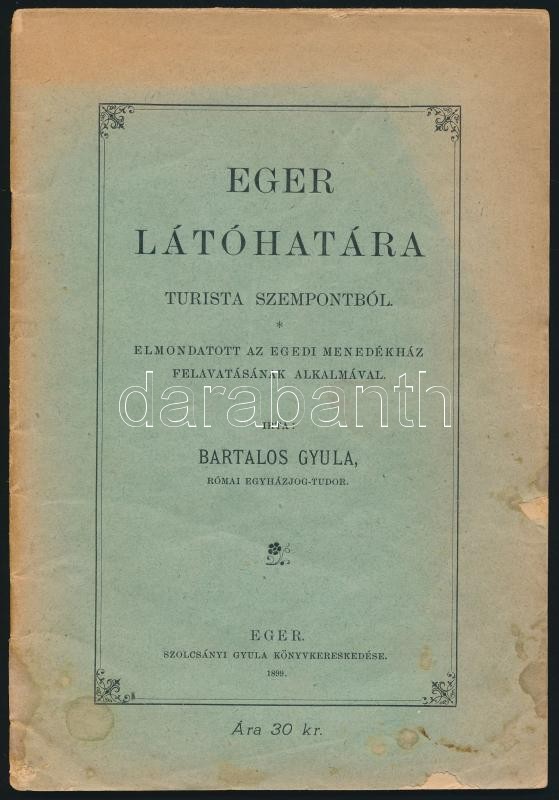 https://www.darabanth.com/en/28-Major-auction/28.1/Other-collectibles/Books-Travelling-Local-History~11237/Bartalos-Gyula-Eger-latohatara-turista-szempontbol-Eger-1899-Szolcsanyi-Gyula-Megviselt-pa~II1650741