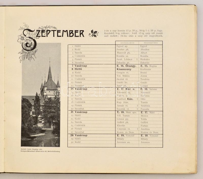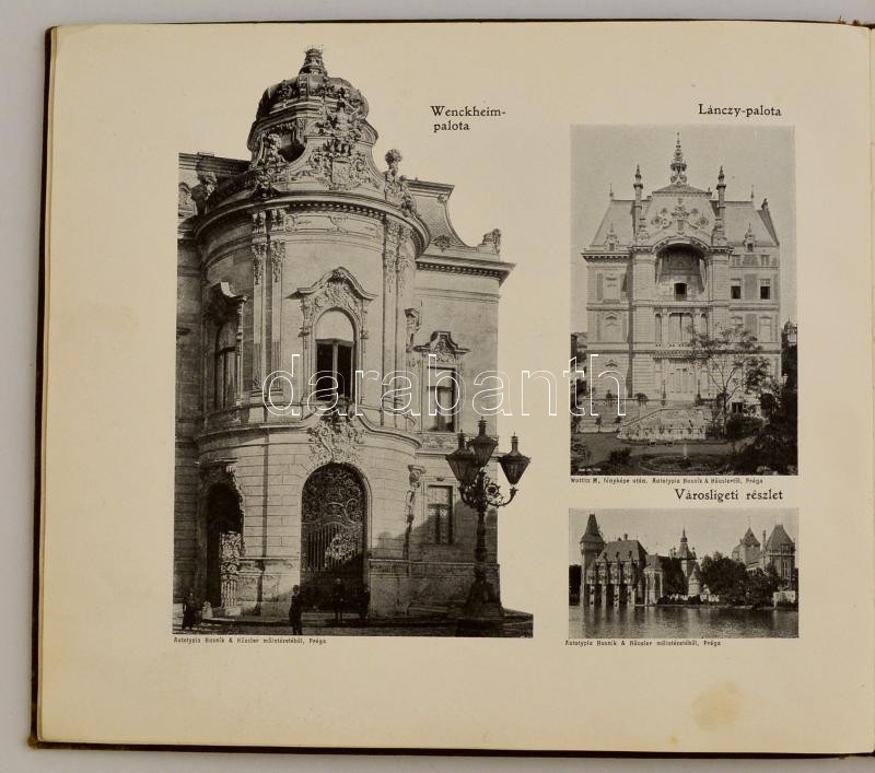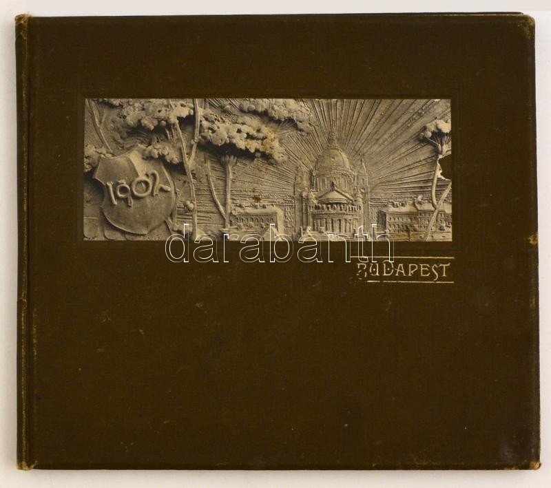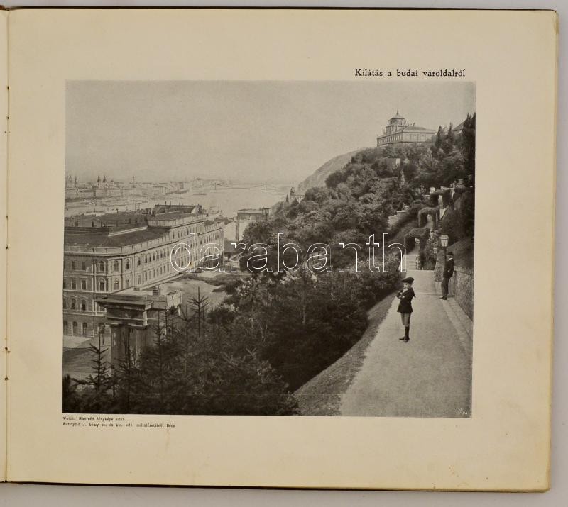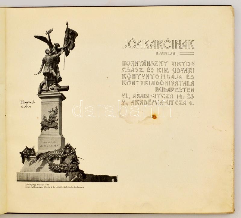 Budapest. Jóakaróinak ajánlja Hornyánszky Viktor Csász. és Kir. Udvari Könyvnyomdája és Könyvkiadóhivatala Budapesten. Budapest, [1901], Hornyánszky Viktor ny., 32 sztl. lev. Kiadói illusztrált egészvászon-kötésben, Müller György könyvkötő kötésében, kopottas borítóval és gerinccel, a hátsó kötéstábla foltos, az elülső kötéstábla belseje firkált, kissé foltos elülső szennylappal, és címoldallal. A Hornyánszky nyomda 1902-re, megrendelői számára készített reprezentatív ajándék-nyomtatványa. Rengeteg fekete-fehér fényképpel illusztrálva Budapestről. A fényképeket Klösz György, Goszleth István, Wottitz Manfréd, Weinwurm Antal, Kiszer Nándor és Strelisky készítette.