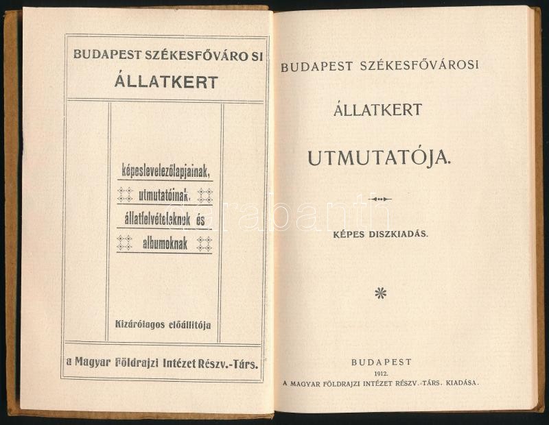Budapest Székesfővárosi Állatkert útmutatója. Képes díszkiadás. Bp., 1... https://www.darabanth.com/en/28-Major-auction/28.1/Other-collectibles/Books-Travelling-Local-History~11237/Budapest-Szekesfovarosi-Allatkert-utmutatoja-Kepes-diszkiadas-Bp-1912-Magyar-Foldrajz~II1674087