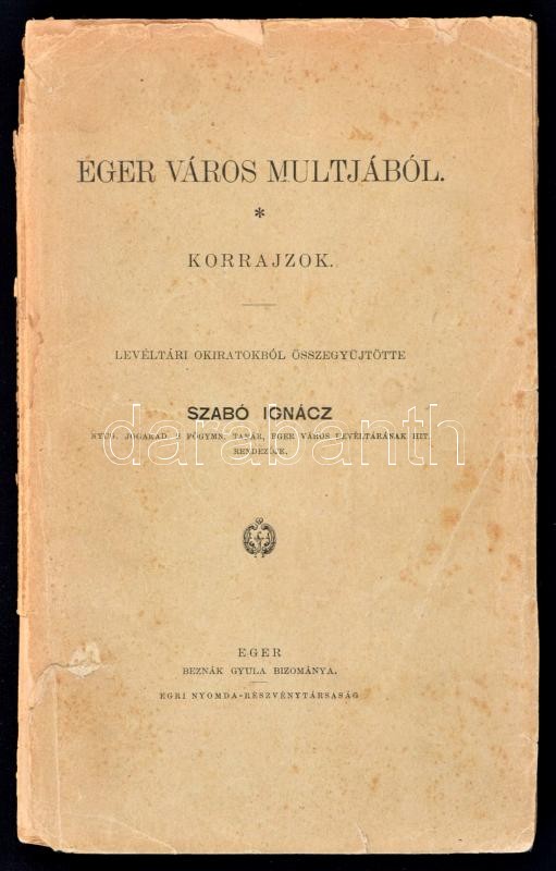 Szabó Ignácz: Eger város multjából. Korrajzok. Eger, 1898, Egri Nyomda Rt.,156+1 p. Kiadói papírkötés, kissé megviselt állapotban, kissé foltos borítóval,a borító szakadt, a gerinc sérült, hiányos, a borító elvált a könyvtesttől, a címlapon névbejegyzéssel, belül jó állapotban. Ritka!