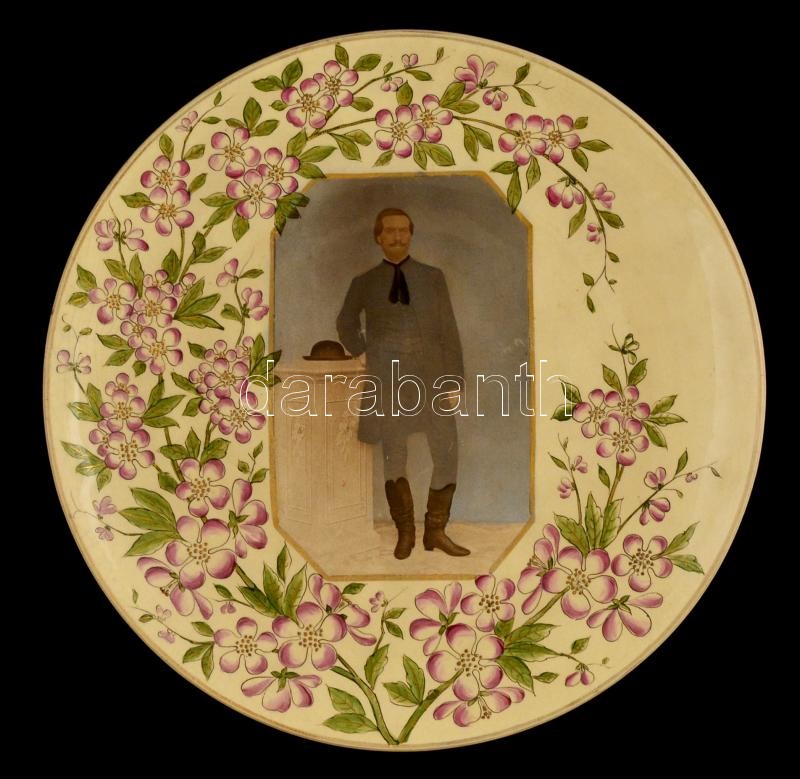 Description: Schütz Cilli fajansz falitál, közepén gróf Migazzy Vilmos (1829-1896) felvidéki földbirtokos egész alakos részben kézzel festett képével, kopott, jelzett, d:34,5 cm