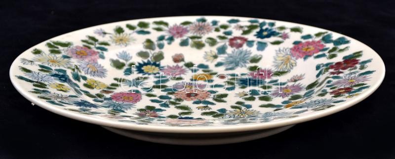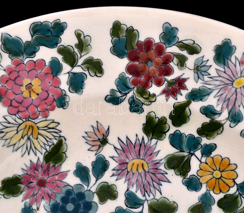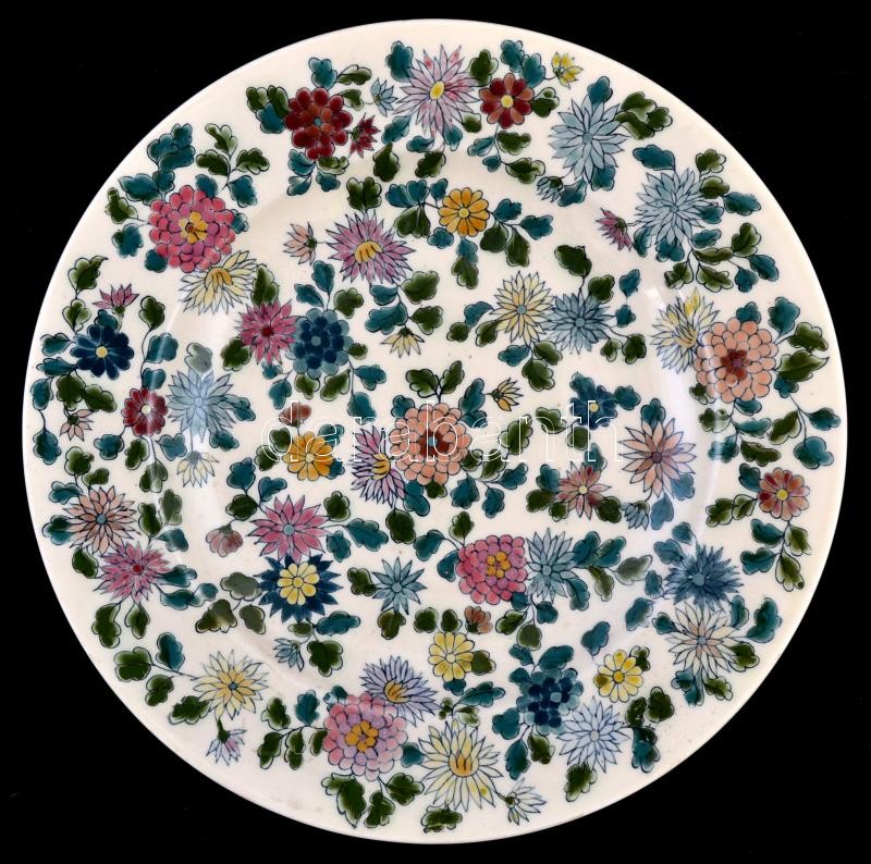 cca 1880 Zsolnay virág mintás tál, kézzel festett porcelánfajansz, jelzett (TJM), hibátlan, d:33,5 cm / cca 1880 Zsolnay plate with floral motifs, handpainted faience, with hallmark (TJM), in flawless condition, d: 33,5 cm