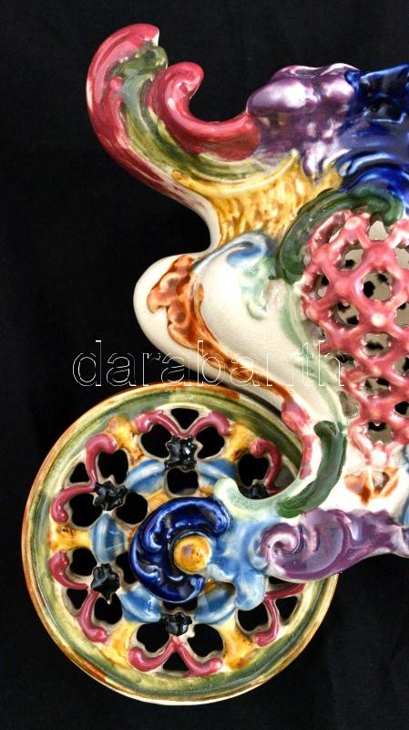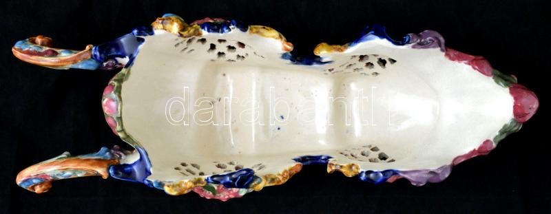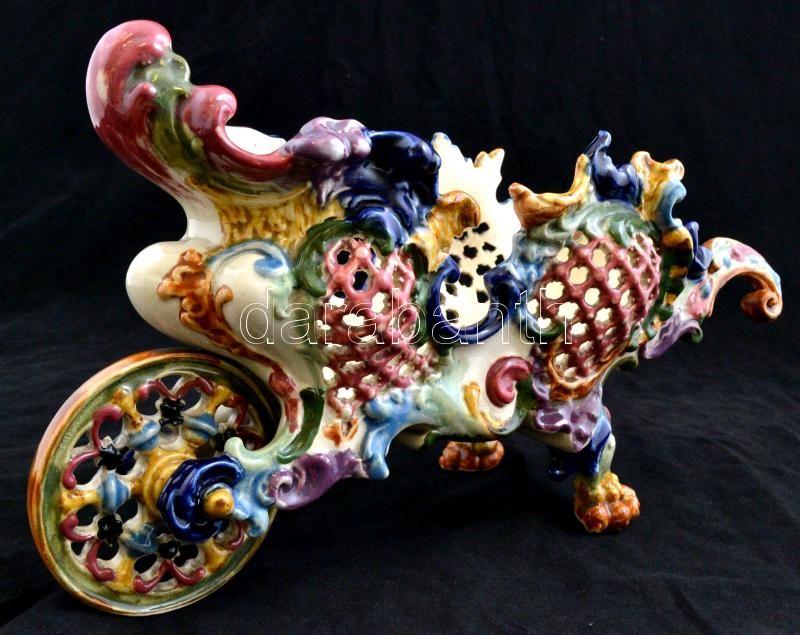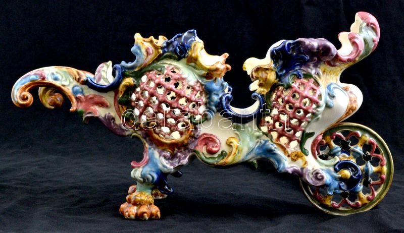 cca 1890 Fischer Ignácz Budapest talicska formájú virágtartó áttört széllel, kézzel festett, jelzett, restaurált, 37×12 cm, m:20 cm
