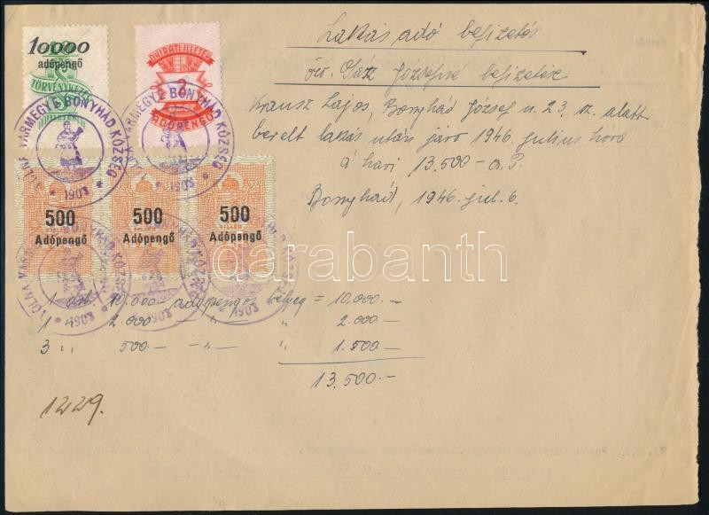 https://www.darabanth.com/en/28-Major-auction/28.1/Other-collectibles/Document-Stamps~11178/1946-Bonyhad-Lakasado-befizetas-13500AP-illetekbelyeggel-Flat-tax-payment~II1588062