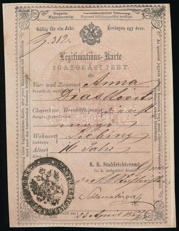 https://www.darabanth.com/en/28-Major-auction/28.1/Other-collectibles/Documents~11180/1857-Soproni-kozigazgatasi-terulet-igazolasi-jegy-6kr-okmanybelyeggel-Bilingual-ID~II1682318