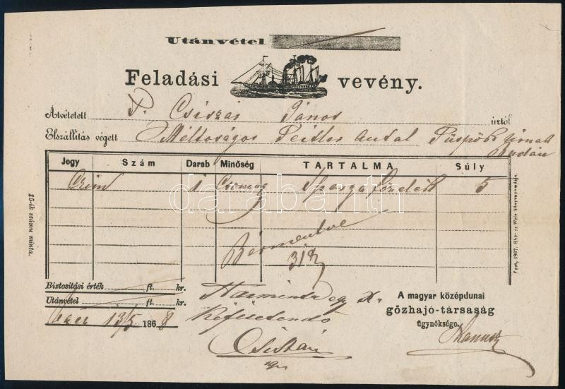 1868 A Középdunai Gőzhajózási Társaság fuvarlevele. Ritka. / Bill of f...
