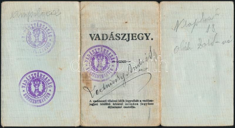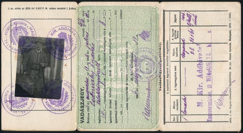 1934 Fényképes vadászjegy és vadászfegyverigazolvány, Ledniczky András kunszentmártoni telekkönyvvezető részére, Kunszentmárton Vadásztársaság pecsétjével.