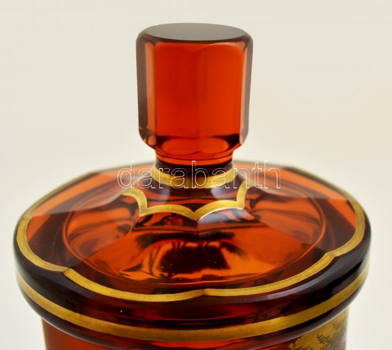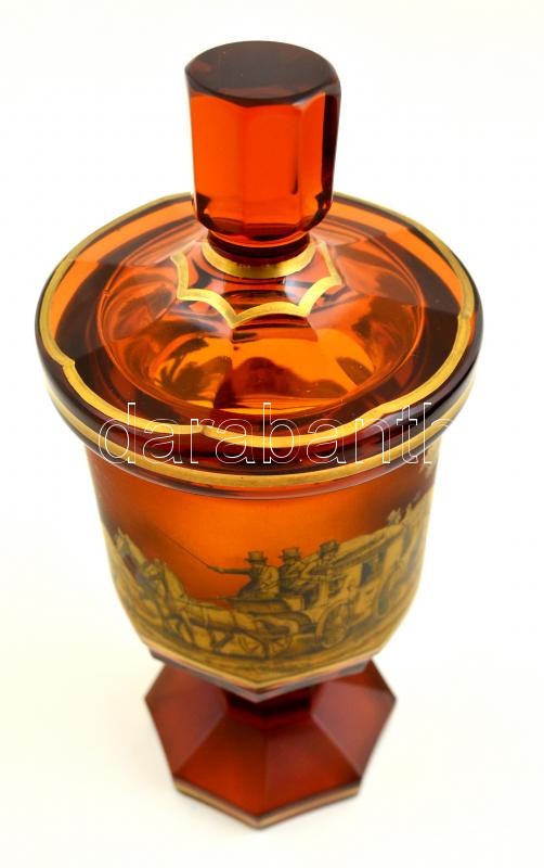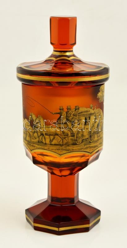 J.M. Pohl tervezte Moser borostyán fedeles kehely, részben kézzel festett, jelzett, hibátlan, m:22,5 cm