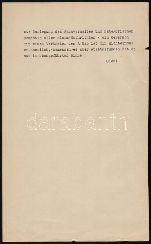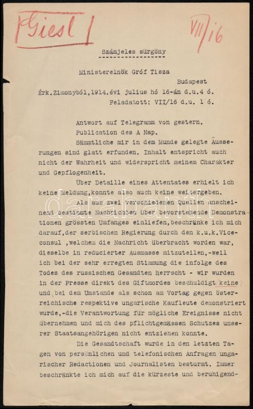 1914 Az Osztrák-Magyar Monarchia belgrádi nagykövete, Lovag Giesl Vladimír távirata Tisza István miniszterelnöknek, melyben a belgrádi közhangulatról számol be. Az orosz követ meggyilkolása után, az osztrák-magyar kereskedők elleni tüntetések, stb. / 1914 Cover of the telegraph to the Hungarian prime minister from the ambassador of the Austro-Hungarian Monarchy to Belgrade in which he descibes the atmosphere in Belgrade towards the monarchy.