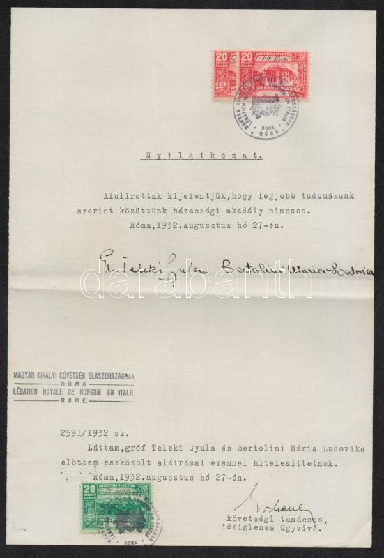 1932 Gr. Teleki Gyula és Bertolini Mária Ludovika aláírt házzassági nyilatkozata a római magyar követségen, a követ aláírásával