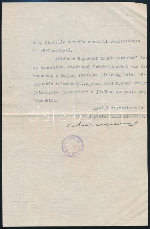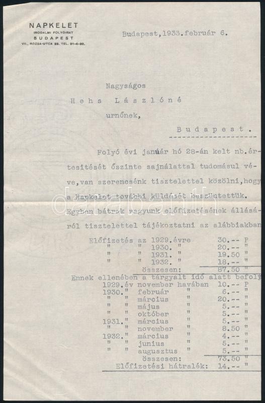 1933 a Napkelet szerkesztőségének gépelt levele Hehs Lászlóné Kilényi Magdolna (?-?) előfizetés lemondása tárgyában, fejléces papíron, borítékkal