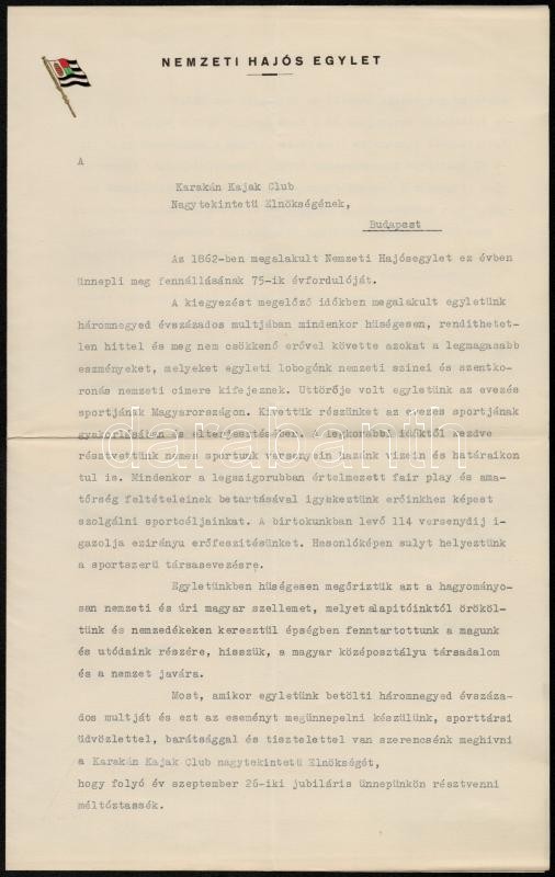 1937 A Nemzeti Hajós Egylet levele társegyletének, a Karakán Kajak Clubnak, amelyben a 75. évfordulóra tartandó, 1937. szeptember 26-iki, ünnepségre meghívják a társegyesületet, fejléces papíron, az egyesület jegyzőjének, valamint elnökének Kertész K. Róbert (1871-1951) elnök, építész, egyetemi tanár, művelődéspolitikus, Keresztény Nemzeti Párt alapító alelnökének aláírásával.