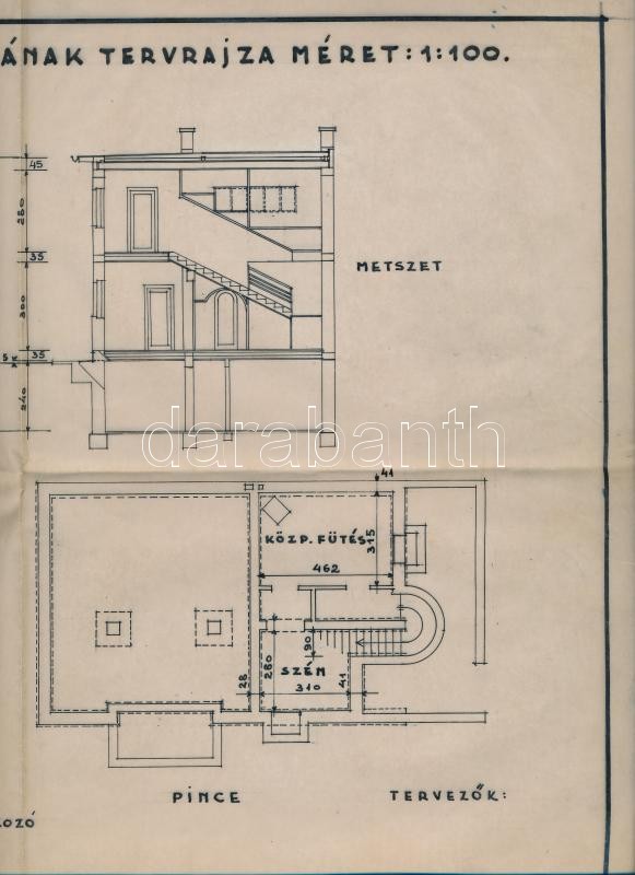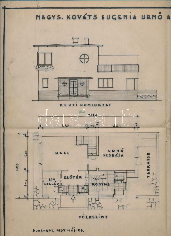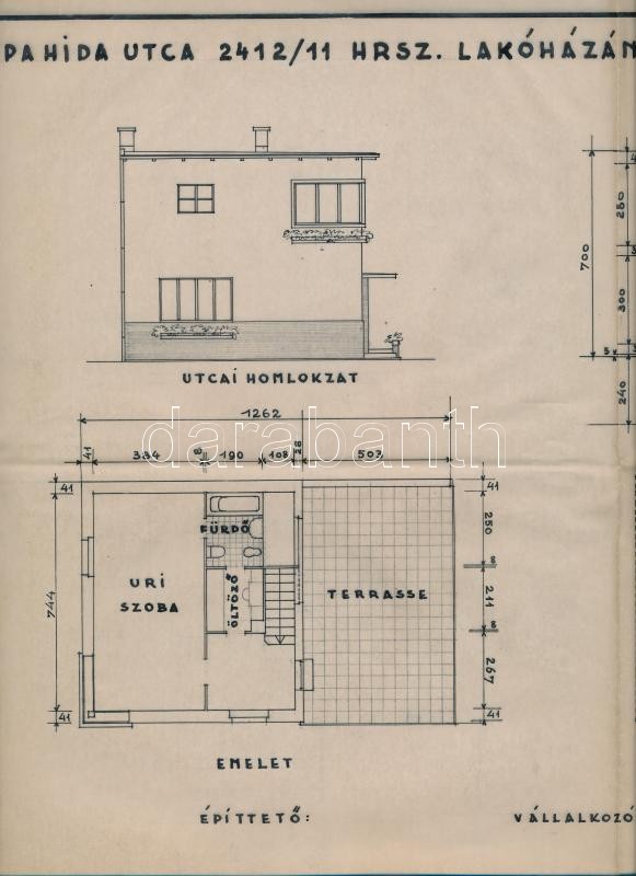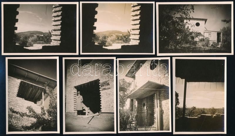 1937 Bp., Apahida utcai lakóház tervrajza (terv.: Németh Emil), a hajtások mentén kis sérülésekkel + az építést dokumentáló 7 db fotó, 6×9 cm