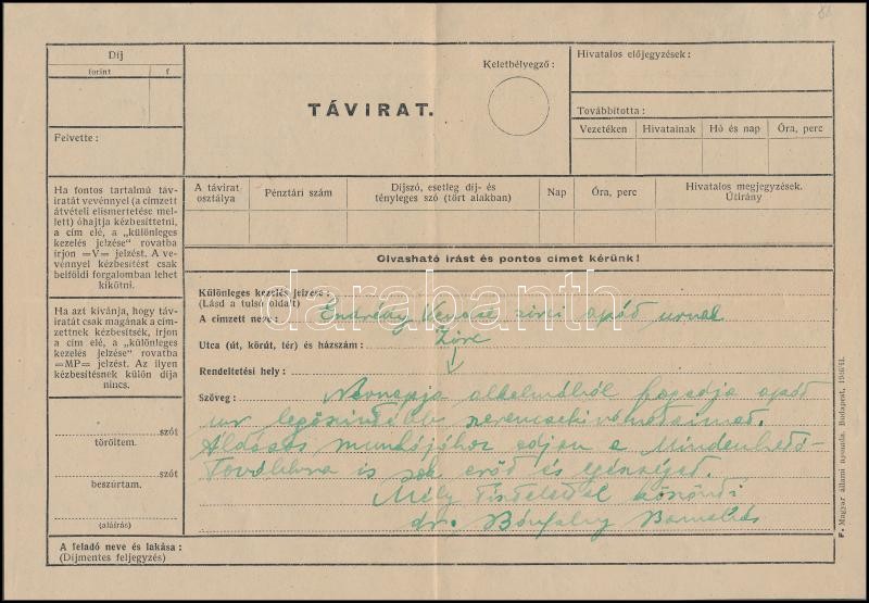 cca 1950 Endrédy Vendel zirci apát számára küldött távirat, általa írt...
