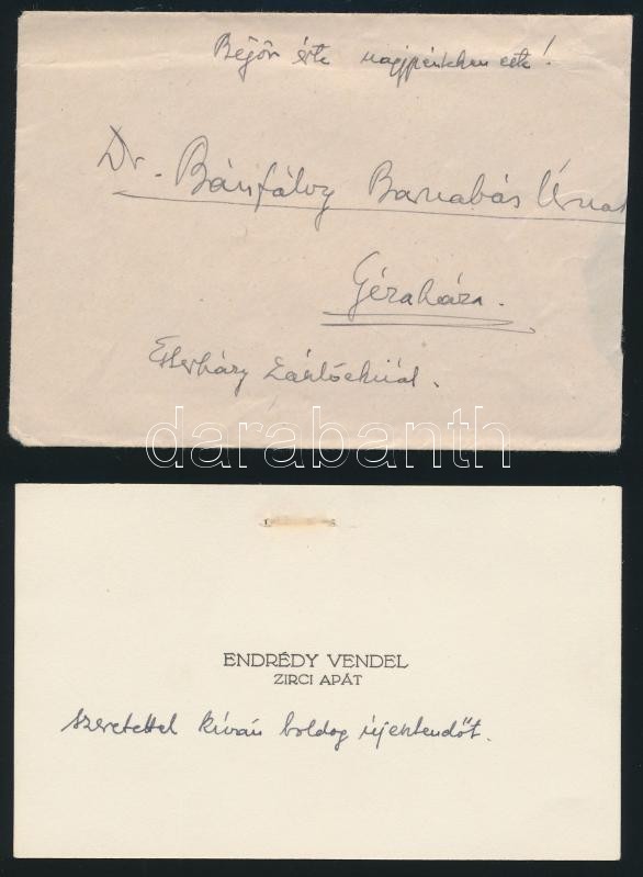 https://www.darabanth.com/en/28-Major-auction/28.1/Other-collectibles/Historical-documents-manuscripts~11297/cca-1950-Endredy-Vendel-zirci-apat-szamara-kuldott-tavirat-altala-irt-level-nevjegykar~II1652253
