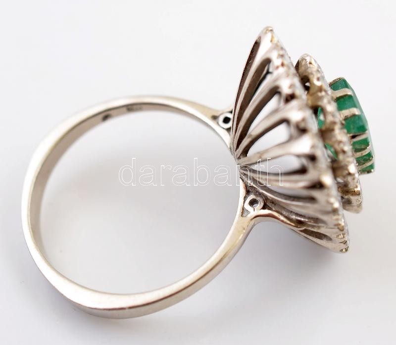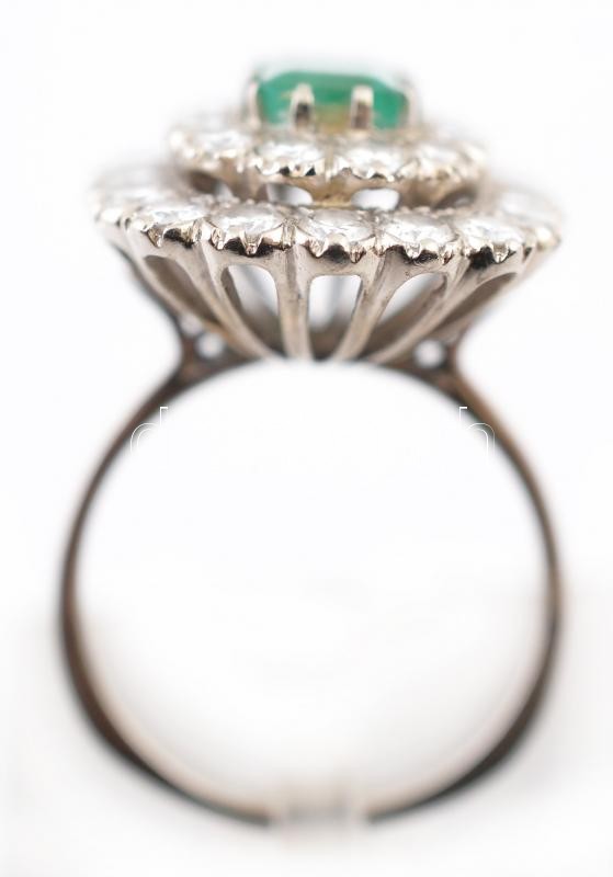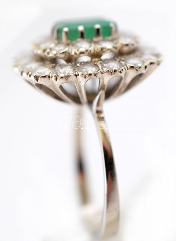 Description: Fehér arany (14 K) gyűrű táblás csiszolású smaragd kővel, körülötte 30 db csiszolt brill kővel (d:30 mm), néhány hibás, bruttó: 5,64 g, méret: 56 / White gold (14K) ring with 30 emerald, some of them are faulty, size: 56