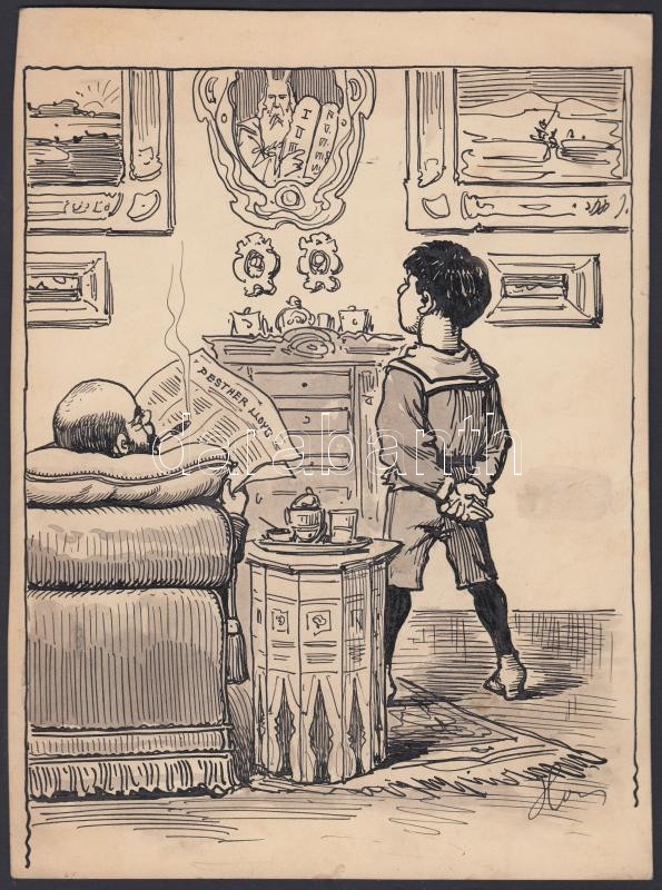 cca 1890 Homicskó Atonáz (1864-1916): Zsidó szobabelső, tusrajz, kart...