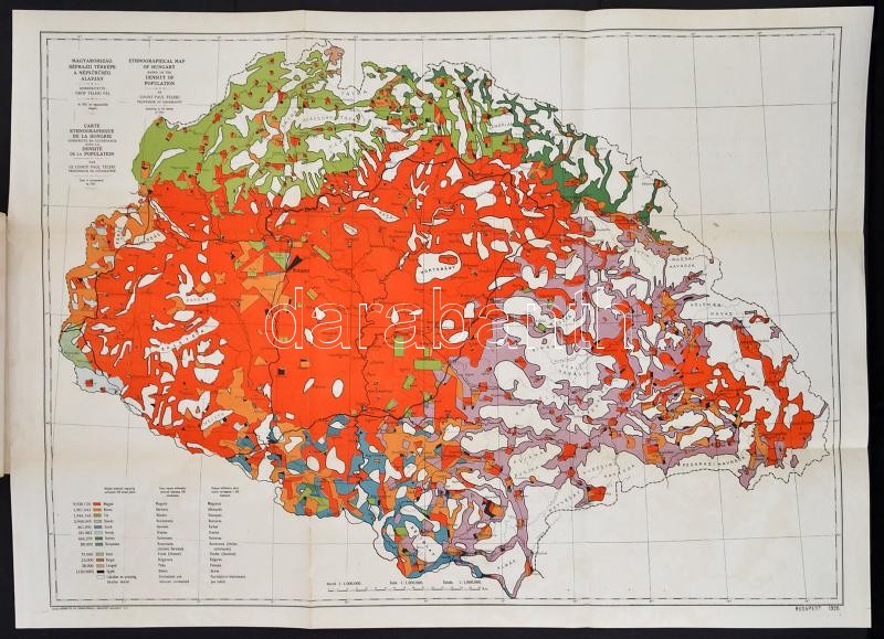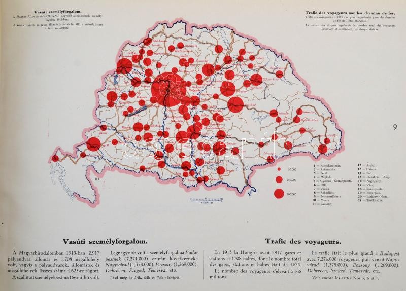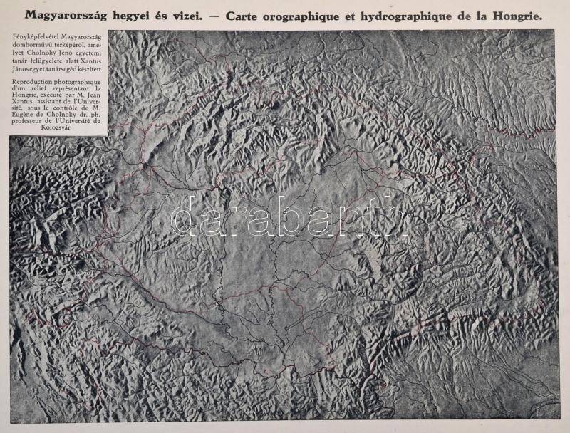 1920 Magyarország gazdasági térképekben. La Hongrie économique en cartes. Kiadja Rubinek Gyula. Szerk.: Edvi Illés Aladár, Halász Albert. Bp.,1920, Pátria, 3 sztl. lev.+74 lev. + 1 kihajtható térkép. Harmadik, bÅ‘vÃtett kiadás. Kiadói haránt alakú papÃrkötés, kopott, szakadozott borÃtóval, a térképek elÅ‘tt feliratozott hártyapapÃrral, magyar és francia nyelven. A mű 77 térképpel és 6 grafikonnal teljes. Két hiány. A munkát külföldiek számára adták ki a trianoni veszteségek érzékeltetésére.