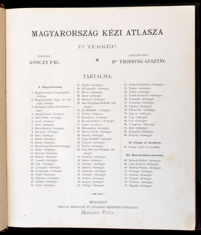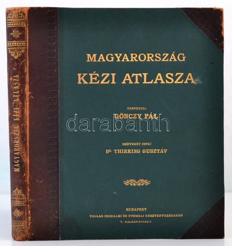 Description: Magyarország kézi atlasza. 75 térkép. Tervezte Gönczy Pál. Szövegét írta: Dr. Thirring Gusztáv. Bp., é.n.[1897], Pallas, 21+2 p. + 75 t. Kiadói aranyozott félbőr-kötésben, kissé kopottas borítósarkokkal, és gerinccel.