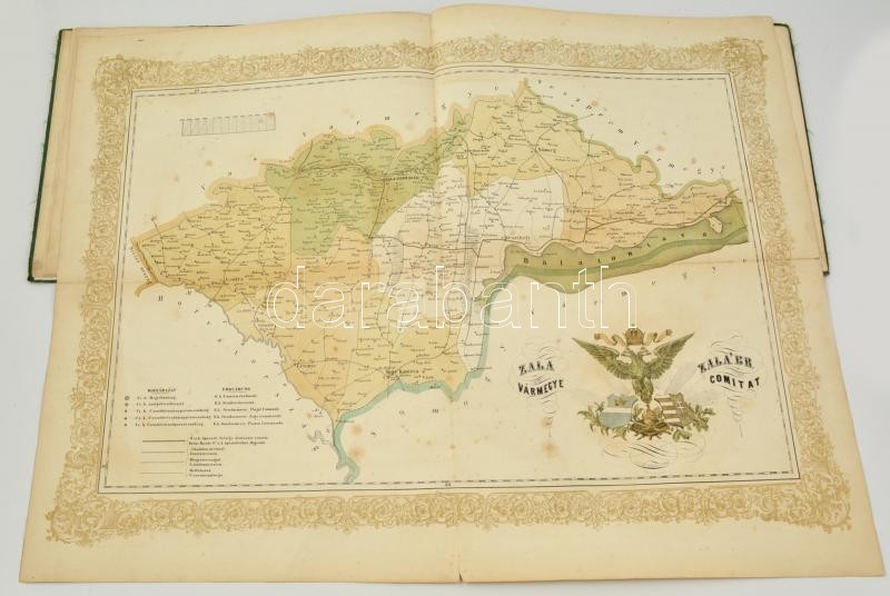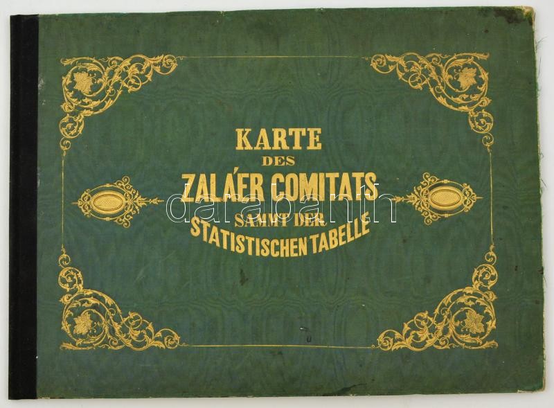 cca 1857-1858 Karte des Zaláer Comitats sammt der statistischen Tabelle. Zala vármegye térképe statisztikai táblázattal. Wien, é.n., Oberheimer. Korabeli kissé kopottas állapotú dúsan aranyozott egészvászon-kötés, javított gerinccel, a hajtás mentén szakadással, gyűrődéssel, színes litografált térkép, kihajtható statisztikai táblázattal, magyar és német nyelven, 56x57 cm. I. Ferenc József zalai látogatására kiadott térkép, az útvonal megjelölésével.