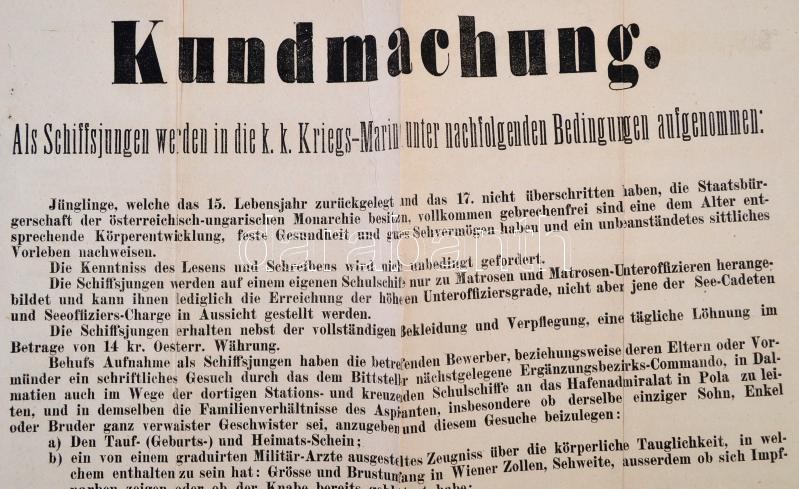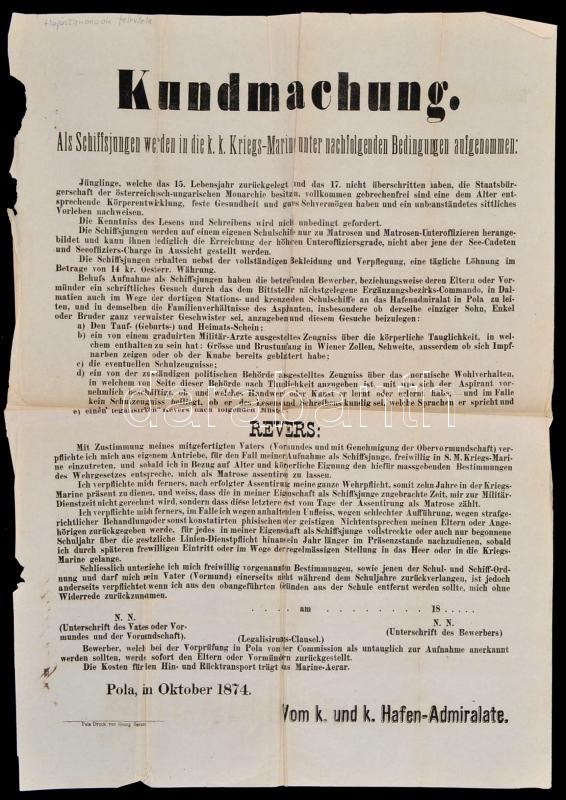 1874 Pola, Osztrák-magyar Haditengerészet matróz toborzó hirdetménye, ... https://www.darabanth.com/en/28-Major-auction/28.1/Other-collectibles/Military~11299/1874-Pola-Osztrak-magyar-Haditengereszet-matroz-toborzo-hirdetmenye-nemet-nyelven-szelein-~II1679574