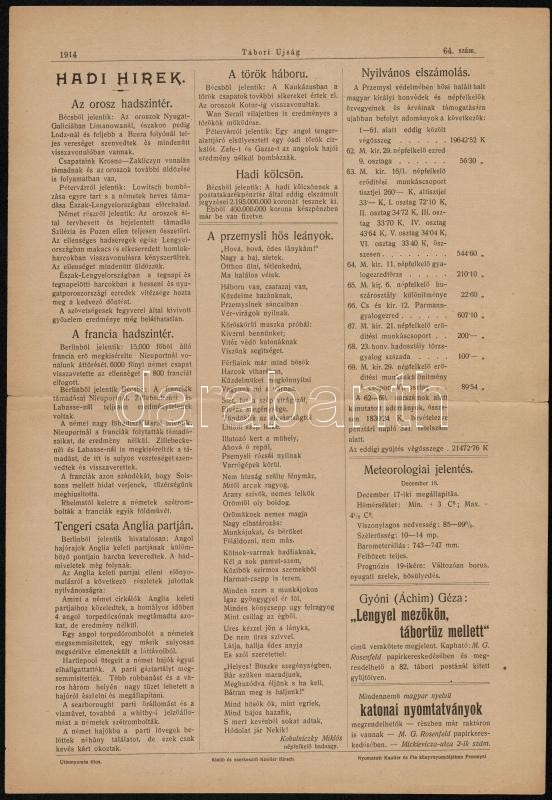 Description: 1914 Przemyśl, Tábori Újság, a 23. honvéd gyalogezred által Przemyśl első és második ostroma alatt naponta-kétnaponta megjelentetett újság 64. lapszáma (dec. 19.), jó állapotban