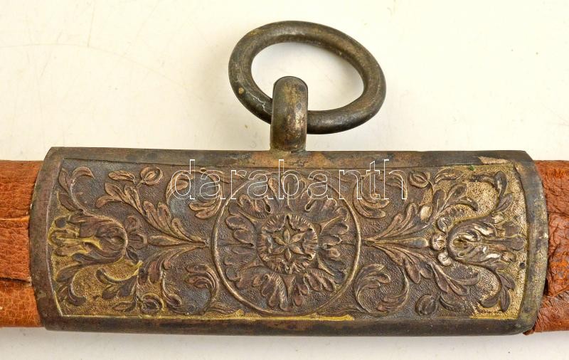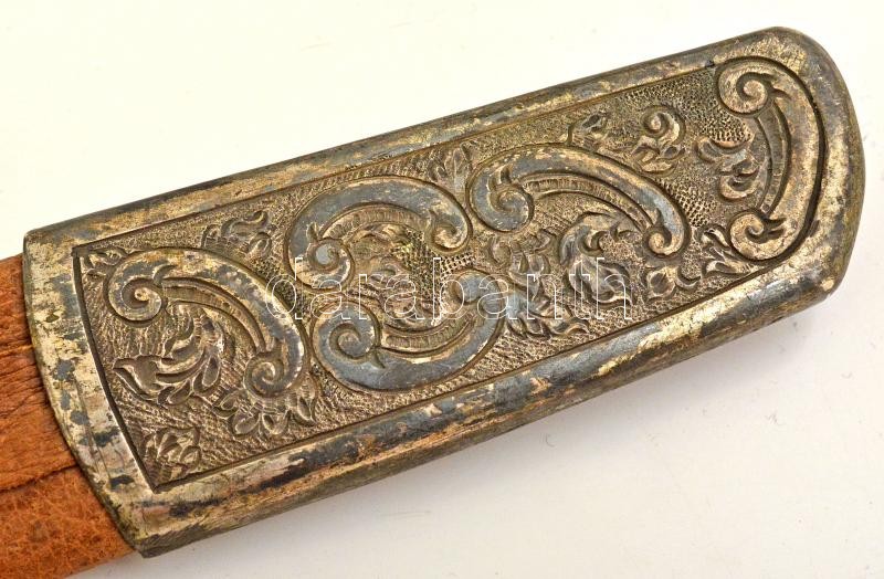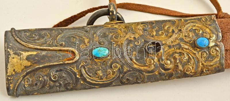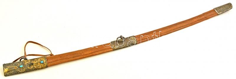 cca 1800 Oszmán tiszti(?) kard hüvelye, aranyozott ezüst (Ag.) szerelékkel, bőr borítással, hiányos türkiz berakással, jelzett, h: 82,5 cm / cca 1800 Ottoman officer(?) sword scabbard, with gilt silver (Ag.) parts, covered with leather, with turqoise inlays, one gem is missing, l: 82,5 cm