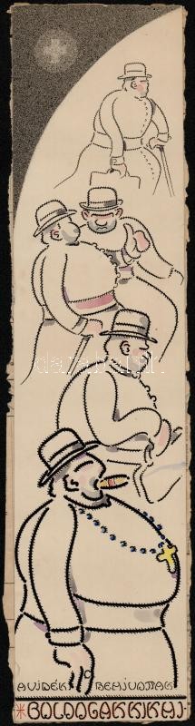 Description: 1922 Schima András (Bandi) (1882-1959): A vidéki behívottak. Politikai karikatúra. Akvarell, vegyes technika, papír, jelzett. Hátoldalán levélzárókkal. 36x9 cm / 1922 Political graphic. 36x9 cm