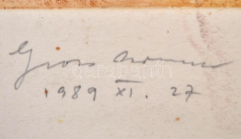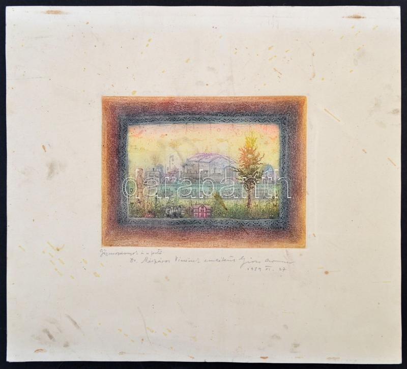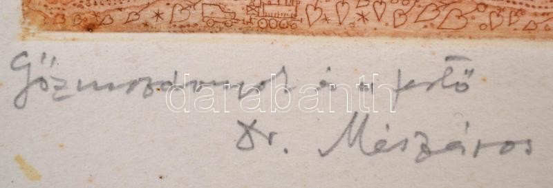 Description: Gross Arnold (1929-2015): Gőzmozdonyok és a festő, színes rézkarc, jelzett, a művész által dedikált Dr. Mészáros Vince (1913-?) technikatörténész, muzeológusnak, dátumozva (1989), kissé foltos, 15x12 cm.