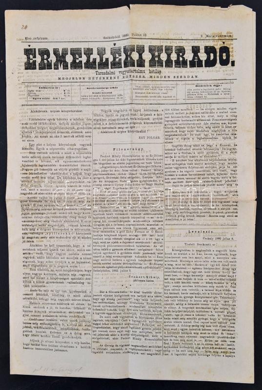 1882 Érmelléki Híradó. Társadalmi vegyestartalmu hetilap. I. évf. 2. s... https://www.darabanth.com/en/28-Major-auction/28.1/Other-collectibles/Periodicals~11656/1882-Ermelleki-Hirado-Tarsadalmi-vegyestartalmu-hetilap-I-evf-2-szmutatvanyszam-188~II1682977