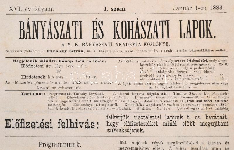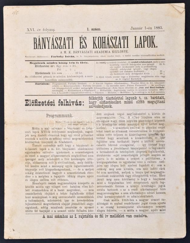 https://www.darabanth.com/en/28-Major-auction/28.1/Other-collectibles/Periodicals~11656/1883-Banyaszati-es-Kohaszati-Lapok-XVI-evf-1-szam-Szerk-Farbaky-Istvan-12-pplus1-famets~II1682215