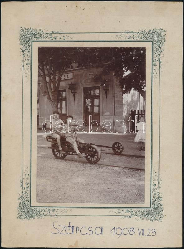1908 Szárcsa, hajtány a vasútállomáson, fotó, kartonra ragasztva, feli...