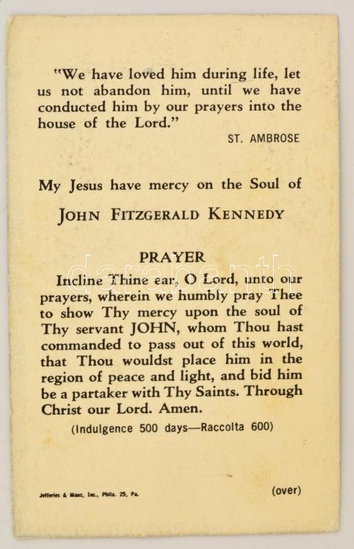 cca 1963 John F. Kennedy gyászjelentő kártyája, 10x6,5 cm