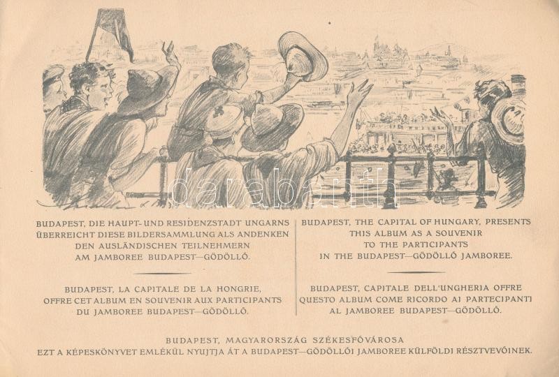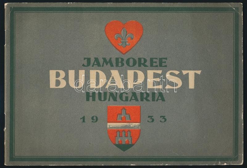 1933 Jamboree Budapest Hungaria 16 oldalas emlékfüzet a külföldi résztvevőknek, német, francia és angol nyelven, Márton Lajos és Richter Aladár grafikákkal. Némileg kopott borítóval. / 1933 Jamboree memorial booklet for the foreigners, in german, french, and english language, with Lajos Marton and Aladar Richter graphics, 16 p.