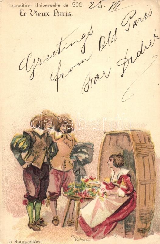 1900 Paris, Exposition Universelle, Le Vieux Paris, La Bouquetiere. Advertisement litho art postcard s: A. Robida (EK)
