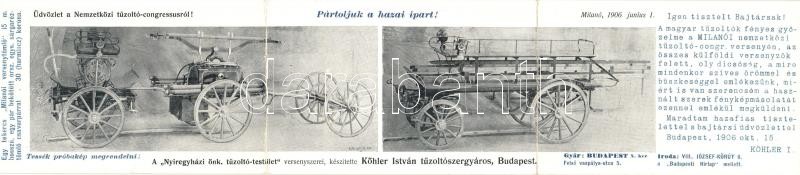 Description: 1906 Köhler István tűzoltó szergyáros reklámlapja. A Nyíregyházi önkéntes tűzoltó-testület versenyszerei a Nemzetközi Tűzoltó-Kongresszusról. Három-részes kihajtható lap / Hungarian firefighter manufacturer advertisement card with fire engines. Three-tiled folding card