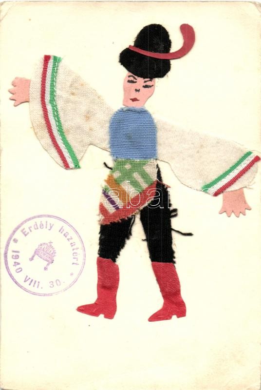 Magyar népviselet. Kézzel készült textil lap / Hungarian folklore. Hand-made textile card, "1940 Erdély hazatért" So. Stpl (EK)
